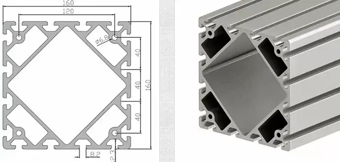T-slot Width: 8.2 mm, T-slot height: 12.3 mm, section size: 160 mm × 160 mm, 4 marginal holes: φ6.8 mm. Wall thickness: 4.5 mm