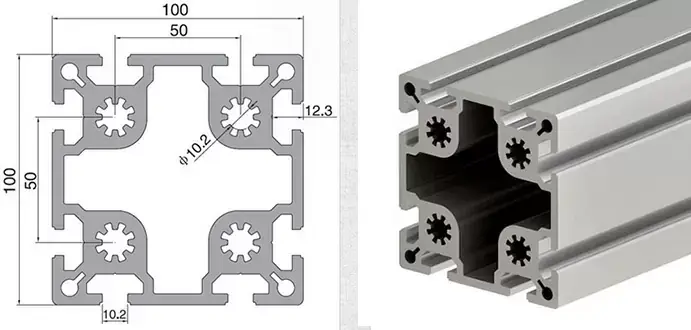 The T-Slot Aluminum Extrusion of the S10-100100 profile is 10.2 mm, ideal for heavy-duty applications where added strength and an additional T-slot aluminum extrusion are a must, when choosing accessories or fasteners, M10 is suitable. In addition, it can be connected with 50 series profiles and other parts such as handle, end connector, caster, etc. T-slot aluminum extrusion is widely used for building blocks, clean rooms, conveyors, CNC, and other frameworks.